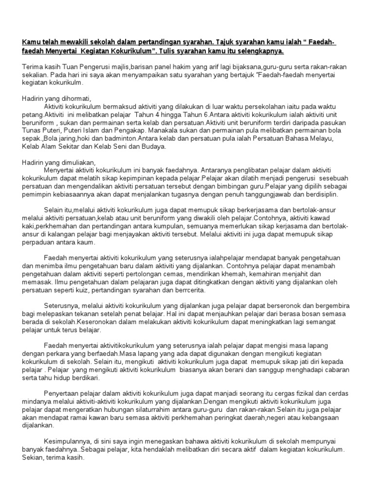 Terdapat banyak jenis kegiatan kokurikulum di. Sekolah kamu telah menganjurkan pertandingan syarahan antara kelas. Contoh karangan pelajar SPM 2013.